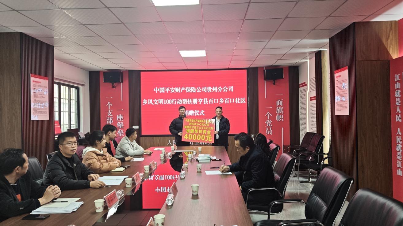 多彩贵州网讯(记者 金星)2026年1月16日,平安产险黔西南中心支公司联合贵州省红十字会在贵州省黔西南州册亨县百口乡百口安置区成功举行“乡风文明100行动”公益项目捐赠仪式。平安产险黔西南中心支公司向百口乡人民政府捐赠专项建设资金4万元,用于推进社区基层治理现代化建设,切实提升搬迁群众居住安全与生活品质。