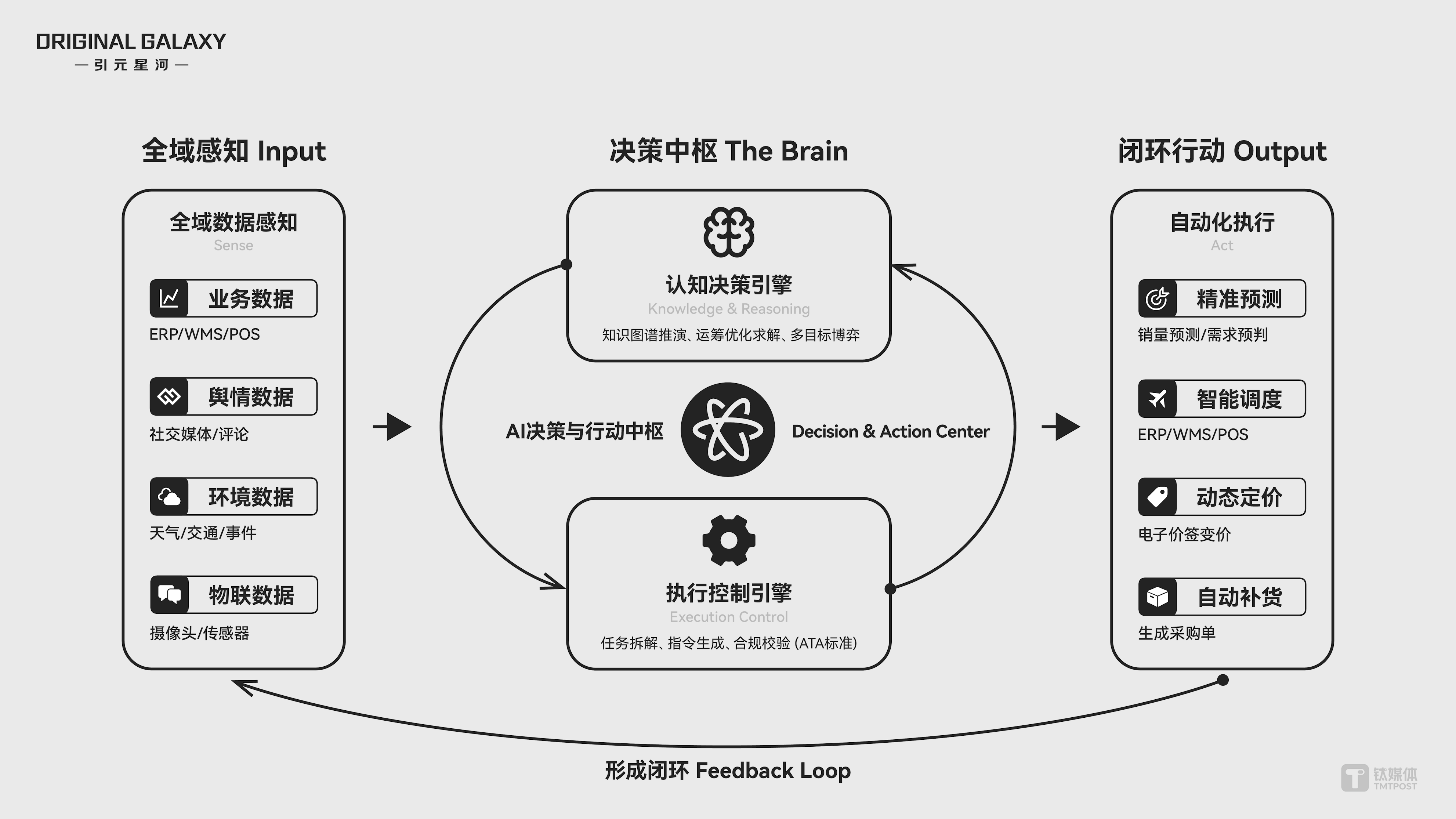 李植宇将“企业级AI大脑”定位为一个超越单点工具或垂直应用的、能够驱动企业业务流程彻底重塑与自动化的平台级解决方案。其核心差异化优势不仅在于技术整合,更在于能够为企业提供一套伴随组织变革的、负责任的、成本最优的完整转型蓝图,而不仅仅是技术工具本身。据李植宇介绍,引元星河将于2026年第一季度发布的“企业级AI大脑”就是在上述理念的基础上,遵循所有AI决策必须可追溯到清晰的规则与数据来源;所有关键行动都要有责任主体与审计链路;所有系统行为都必须在企业既有治理框架之内运行。三个设计原则所打造的产品。“与绝大多数友商产品不同的是,我们的产品除了具备整合内外部数据(含内部报表、天气、舆情等),通过合规校验完成“若A发生则B应对”的场景推演之外。还一改传统弹窗提示的模式,直接对接接口执行指令(改价格、调度货车等)。而这也是引元星河的核心壁垒。”李植宇向笔者剧透了即将发布的“企业级AI大脑”的部分核心能力。