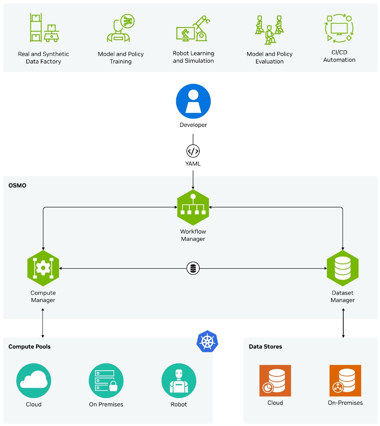 另一款框架OSMO则聚焦“全流程整合”——作为云原生编排工具,它能将机器人开发的各个环节(合成数据生成、模型训练、软件测试)整合到一个“命令中心”,支持开发者跨计算环境操作,无论是本地工作站还是混合云实例,都能高效协同。目前,Hexagon Robotics等企业已开始使用OSMO,微软也将其集成到Azure Robotics Accelerator工具链中,进一步扩大生态覆盖。