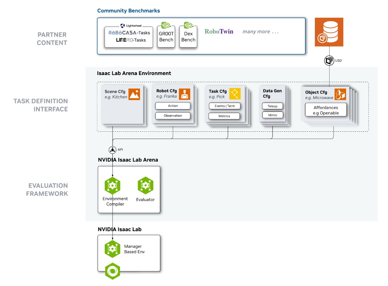 模型之外,开发框架的升级同样关键。针对机器人训练“工作流分散、难以管理”的问题,NVIDIA在GitHub发布了Isaac Lab-Arena开源框架——这是一个专为大规模机器人策略评估与基准测试设计的协作系统,不仅能对接Libero、Robocasa等业界主流基准测试体系,还能通过标准化测试流程,确保机器人技能在落地前具备稳健性。比如开发者训练一款搬运机器人后,可通过Isaac Lab-Arena模拟不同地面材质、货物重量的场景,验证机器人是否能稳定工作,避免“虚拟训练优秀、现实落地失效”的问题。